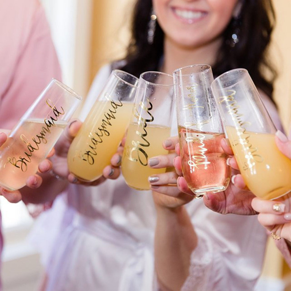 Stoßen Sie mit einem stiellosen Champagnerglas mit einem hübschen goldenen personalisierten Akzent auf Ihre Damen an. Perfekt zum Nippen beim Brunch, um die Hochzeitspläne zu besprechen oder ein Gruppenfoto für das Fotoalbum am großen Tag zu schießen.