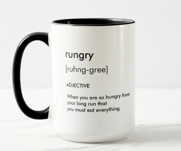 Vor der Sonne aufzustehen, um zweistellige Kilometerzahlen zu schaffen, bedeutet, dass Sie, wenn Sie nach Hause kommen, kein Essen und keinen Kaffee wollen, sondern ihn brauchen. Der Rungry-Becher fasst Ihre Gefühle perfekt zusammen und fasst genug Kaffee, um Sie wach zu halten, bis Sie fertig essen und ein Nickerchen machen können.